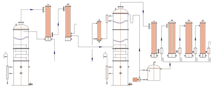 結構特點:1.采用不同的結構適應于不同的物系分離,可將酒精中的高沸點雜質與低沸點雜質全部去除,滿足高純度食用酒精的生產需求。2.設備主要由塔釜、再沸器、塔節(jié)、冷凝器、冷卻器、連接管等組成。3.該設備采用自回流或強制回流方式,操作簡單方便,可配PLC自動控制。