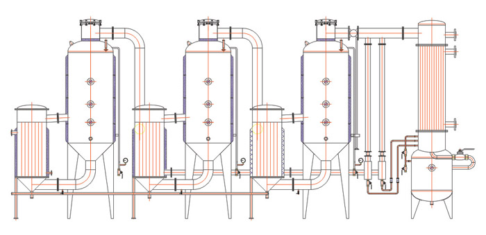 1. 設(shè)備主要由一二三效加熱器、一二三效蒸發(fā)器、冷凝器、貯液罐、汽水分離器、消泡器、循環(huán)管等部分組成。