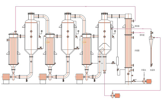 設(shè)備用途: 本設(shè)備適用于制藥、食品、化工、生物工程、環(huán)保工程等行業(yè)含鹽廢水終端處理,用于易結(jié)晶、易結(jié)垢廢水濃縮。蒸發(fā)器依靠外加力循環(huán)泵使液體進行循環(huán),液體循環(huán)速度大小由泵調(diào)節(jié)。針對化工有機廢水高鹽分高濃度等特點,基于蒸發(fā)濃縮結(jié)晶的原理,采用多效減壓蒸發(fā)濃縮結(jié)晶有機廢水,對濃縮液中的鹽分進行分離后,通過集鹽器進行回收,濃縮液進行干燥回收或焚燒處理,,蒸發(fā)后的冷凝水一般通過后續(xù)的生化處理進行處理,可以實現(xiàn)廢水排放的標準。 結(jié)構(gòu)特點: 1. 本設(shè)備由加熱器、結(jié)晶蒸發(fā)器、預(yù)熱器、冷凝器、循環(huán)泵等部分組成。 2. 該設(shè)備在真空低溫條件下運行,具有料液流速快、蒸發(fā)快等特性。 3. 蒸發(fā)器通過強制循環(huán),在管內(nèi)受熱均勻,傳熱系數(shù)高,可防止干壁現(xiàn)象。 4. 設(shè)備根據(jù)廢水或污水特性,針對性的采用防腐蝕材料制造。 5. 采用多效蒸發(fā),二、三次蒸氣可得到重復(fù)使用,節(jié)能效果顯著,操作方便、安裝簡單。 6. 結(jié)構(gòu)緊湊,站地面積小,各儀表閥門配置合理方便操作。 工作原理: 蒸發(fā)器的兩大部分換熱室和結(jié)晶蒸發(fā)室,通過循環(huán)泵,液體在列管中循環(huán),在高于正常液體沸點壓力下加熱至過熱。進入分離器后,液體的壓力迅速下降,導(dǎo)致部分液體閃蒸,或迅速沸騰。蒸發(fā)產(chǎn)生的二次蒸汽進入下一效蒸發(fā)器加熱或進入冷凝器冷凝。濃縮液被循環(huán)泵送至鹽分離器,在鹽分離器內(nèi)使鹽水有效分離。 |
